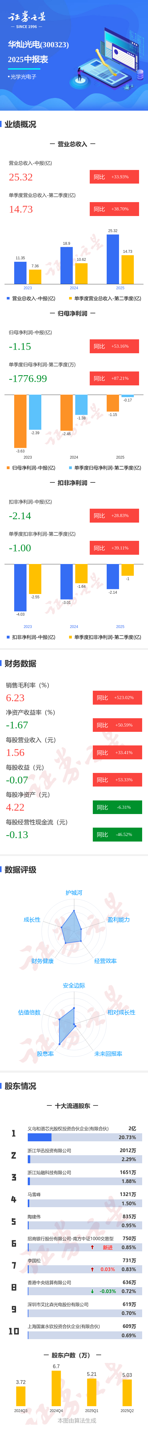 证券之星消息,华灿光电2025年中报显示,公司主营收入25.32亿元,同比上升33.94%;归母净利润-1.15亿元,同比上升53.17%;扣非净利润-2.14亿元,同比上升28.83%;其中2025年第二季度,公司单季度主营收入14.73亿元,同比上升38.71%;单季度归母净利润-1776.99万元,同比上升87.21%;单季度扣非净利润-1.0亿元,同比上升39.11%;负债率49.23%,投资收益-129.07万元,财务费用5824.95万元,毛利率6.23%。