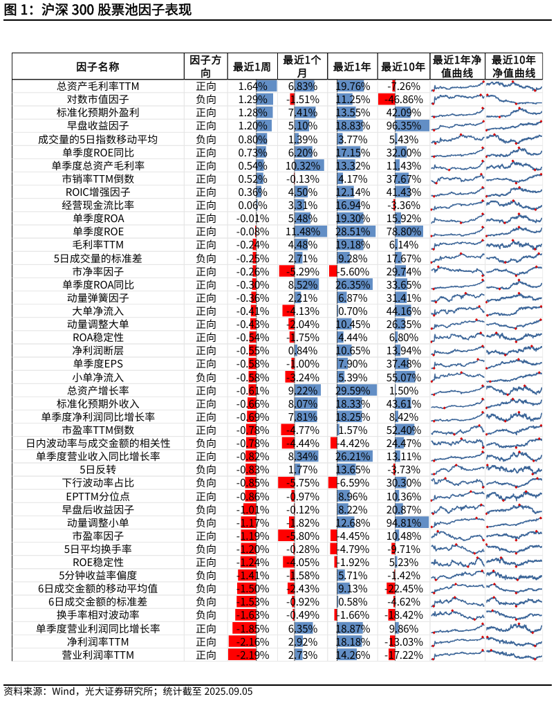 单因子表现来看,沪深300股票池中,本周表现较好的因子有总资产毛利率TTM (1.64%)、对数市值因子(1.29%)、标准化预期外盈利 (1.28%)。表现较差的因子有营业利润率TTM (-2.19%)、净利润率TTM (-2.16%)、单季度营业利润同比增长率 (-1.85%)。