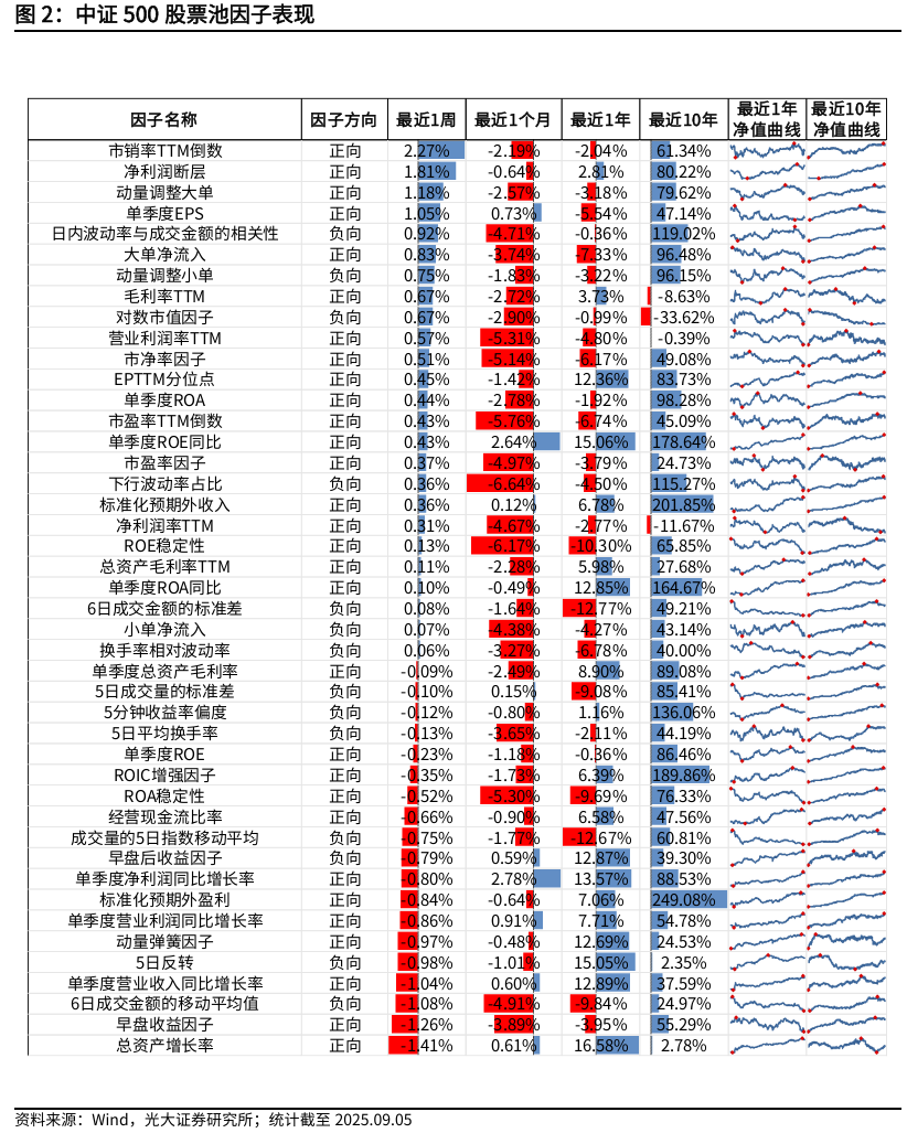 中证500股票池中,本周表现较好的因子有市销率TTM倒数(2.27%)、净利润断层 (1.81%)、动量调整大单(1.18%)。表现较差的因子有总资产增长率 (-1.41%)、早盘收益因子(-1.26%)、6日成交金额的移动平均值(-1.08%)。
