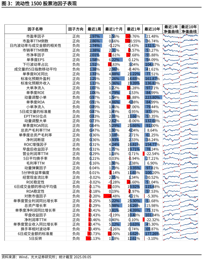 流动性1500股票池中,本周表现较好的因子有市盈率因子(2.97%)、市盈率TTM倒数(2.86%)、日内波动率与成交金额的相关性(2.74%)。表现较差的因子有5日反转 (-1.13%)、6日成交金额的标准差(-0.73%)、换手率相对波动率(-0.49%)。