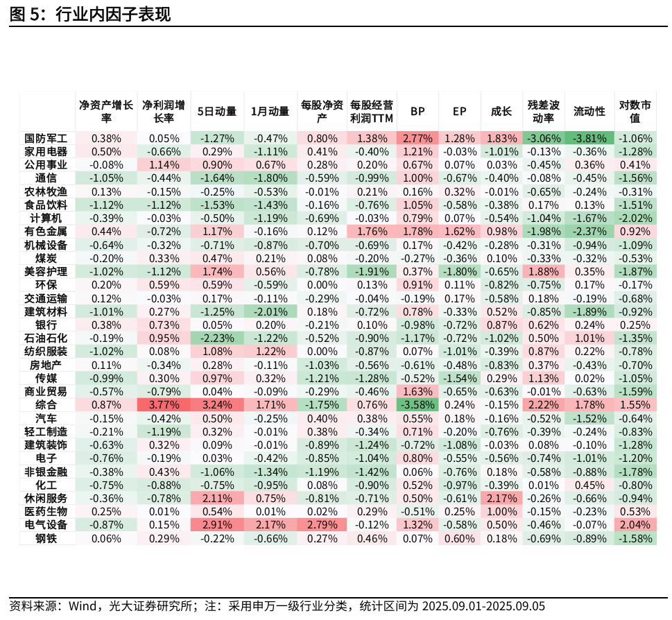 因子行业内表现,本周,基本面因子在各行业表现分化,净利润增长率因子在综合、公用事业正收益明显;每股净资产因子在电气设备正收益明显;每股经营利润TTM因子在有色金属、国防军工正收益明显。估值类因子中, BP因子和EP因子在国防军工、有色金属正收益较为一致。残差波动率因子和流动性因子在综合行业正收益明显。市值风格上,本周多数行业小市值风格显著。