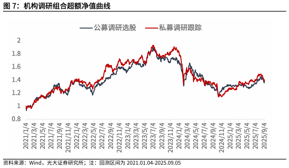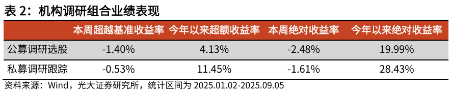 本周公募调研选股策略和私募调研跟踪策略获取负超额收益。公募调研选股策略相对中证800获得超额收益-1.40%,私募调研跟踪策略相对中证800获得超额收益-0.53%。