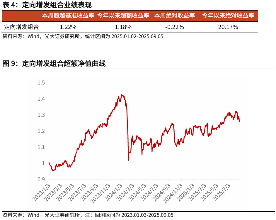 本周定向增发组合相对中证全指获取正超额收益,定向增发组合相对中证全指获得超额收益1.22%。