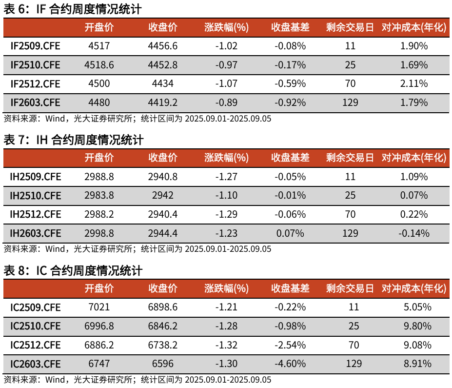 本周IF当月合约下跌1.02 %,收于4456.6,收盘基差-0.08%;IH当月合约下跌1.27 %,收于2940.8,收盘基差-0.05%;IC当月合约下跌1.21 %,收于6898.6,收盘基差-0.22%;IM当月合约下跌1.74%,收于7226,收盘基差-0.27%。