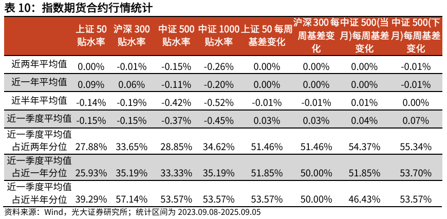 本周上证50、沪深300指数期货主力合约贴水率环比前一交易周下降,中证500、中证1000指数期货主力合约贴水率环比前一交易周上升。IF当月合约近一季度平均每周基差变化0.03%,相比于近半年的-0.01%环境变好。IH当月合约近一季度平均每周基差变化0.03%,相比于近半年的-0.01%环境变好。IC当月合约近一季度平均每周基差变化0.04%,相比于近半年的0.01%环境变好。