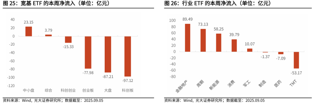 宽基ETF方面,本周中小盘主题ETF资金净流入明显,合计流入23.15亿元。行业ETF方面,本周金融地产主题ETF资金净流入明显,合计流入89.49亿元。