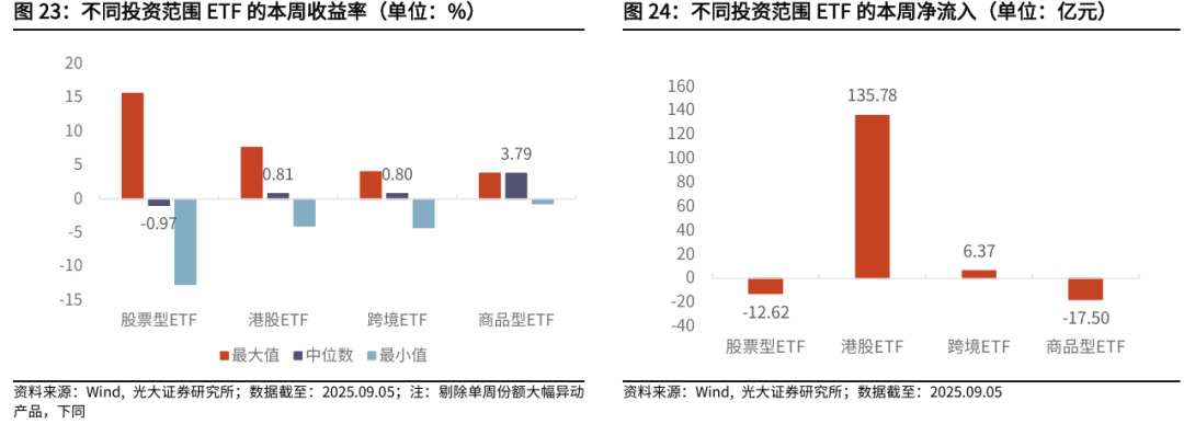 股票型ETF本周收益中位数为-0.97%,资金净流出12.62亿元。港股ETF本周收益中位数为0.81%,资金净流入135.78亿元。跨境ETF本周收益中位数为0.80%,资金净流入6.37亿元。商品型ETF本周收益中位数为3.79%,资金净流出17.50亿元。