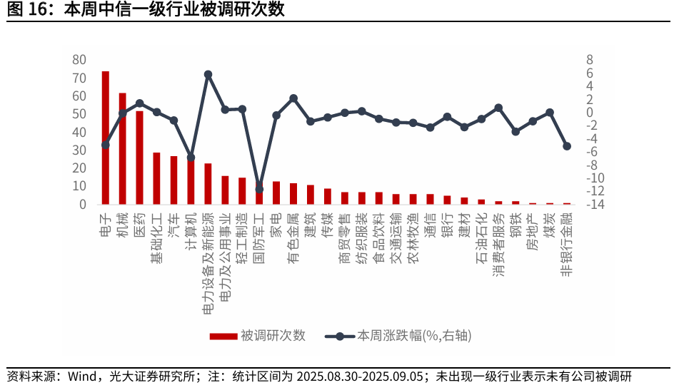 从中信一级行业来看,本周电子、机械和医药行业被调研次数较多,本周涨跌幅依次为-4.86%、-0.03%和1.49%。