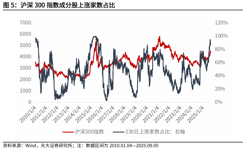 截至2025年9月5日,该指标最近一周下降,上涨家数占比指标目前高于80%,市场情绪较高。
