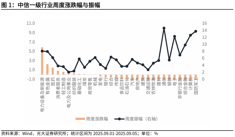 从中信一级行业来看,本周涨幅最高的前5大行业依次为电力设备及新能源、有色金属、医药、消费者服务、轻工制造;中信一级行业中振幅最高的前5大行业依次为通信、国防军工、计算机、电子、综合金融。
